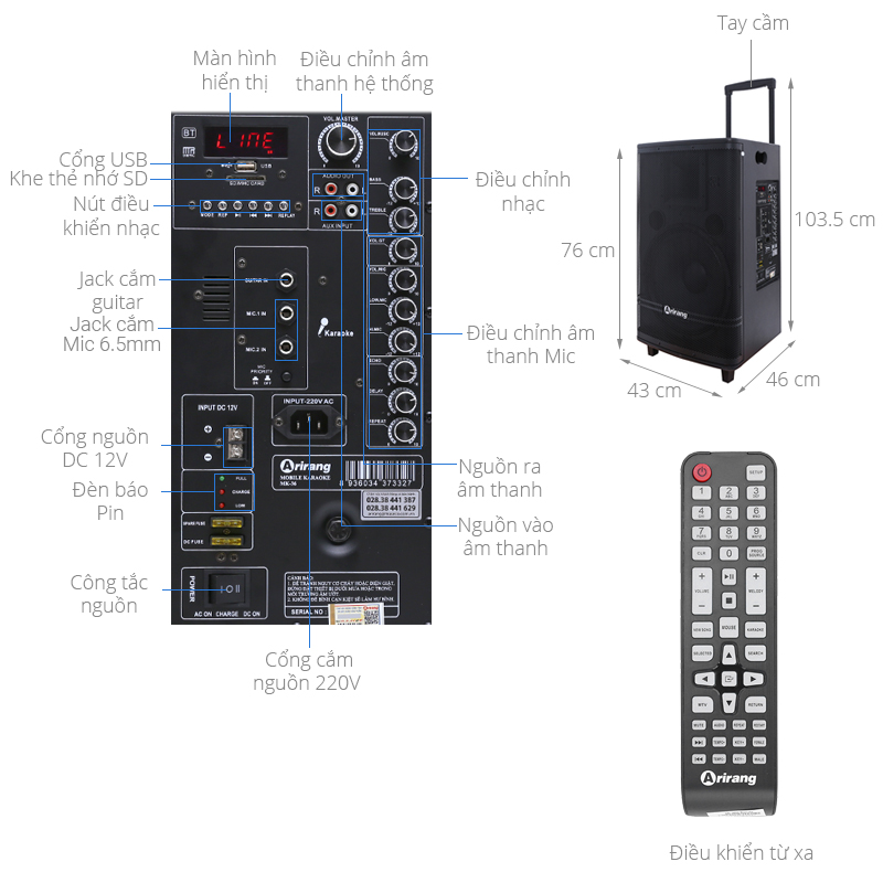 Mặt sau của loa kéo Arirang MK-36 được bố trí 1 bảng điều khiển với các nút tinh chỉnh được minh họa cụ thể rõ ràng các chức năng của từng nút giúp người sử dụng thuận tiện hơn.