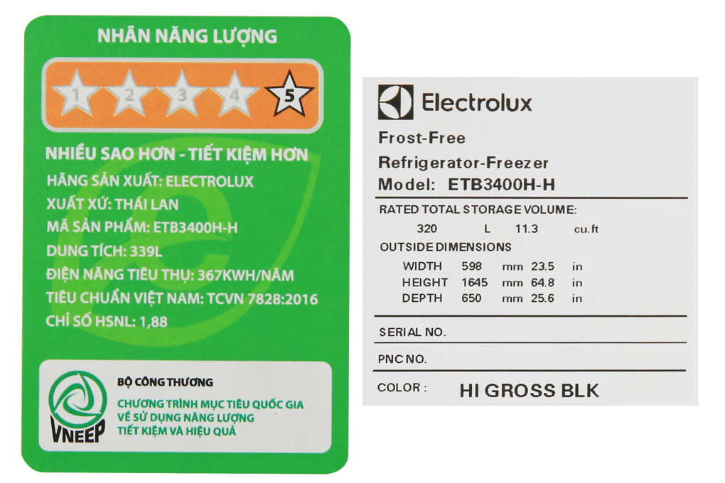 Thông số kỹ thuật chi tiết Tủ lạnh Electrolux Inverter 318 lít ETB3400H-H